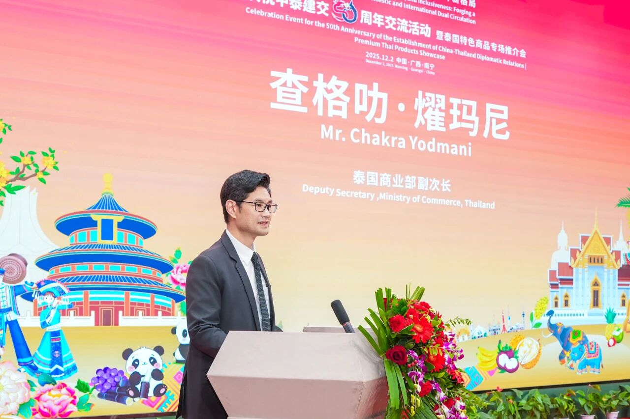 12月2日,“親誠惠容·共拓內(nèi)外貿(mào)雙循環(huán)新格局——慶祝中泰建交50周年交流活動暨泰國特色商品專場推介會”在中國—東盟特色商品匯聚中心隆重舉辦。本次活動由泰國商業(yè)部、泰國商業(yè)部國際貿(mào)易促進司、中國國際貿(mào)易促進委員會廣西壯族自治區(qū)分會、中國—東盟商務(wù)理事會聯(lián)席秘書處、中國—東盟特色商品匯聚中心(簡稱“匯聚中心”)聯(lián)合主辦,中國國際商會廣西商會、中國檢驗認(rèn)證集團廣西有限公司、廣西達(dá)譯科技有限公司、邁越科技股份有限公司、方圓標(biāo)志認(rèn)證集團廣西有限公司作為支持單位參與此次活動。