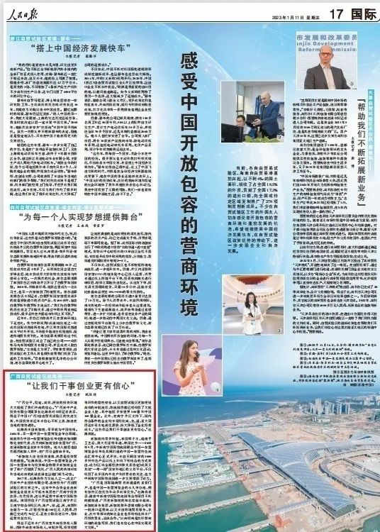 1月11日,《人民日報(bào)》第17版刊登《感受中國開放包容的營商環(huán)境》的報(bào)道。得益于中國(廣西)自由貿(mào)易試驗(yàn)區(qū)的快速發(fā)展,外國投資者切身感受著開放包容的營商環(huán)境和蓬勃發(fā)展的機(jī)遇,加速在當(dāng)?shù)氐脑鲑Y進(jìn)資。其中采訪了廣西新中產(chǎn)業(yè)投資有限公司董事長趙海燕,相關(guān)報(bào)道摘錄如下: